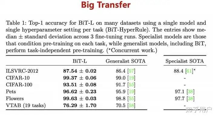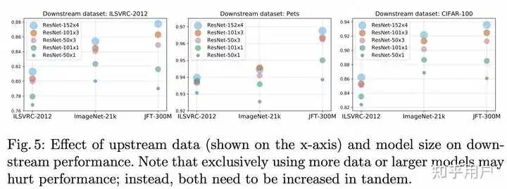以谷歌2021年发布的视觉迁移模型 Big Transfer,BiT 为例。扩大数据规模也能带来精度提升,例如使用 ILSVRC-2012(128 万张图片,1000 个类别)和 JFT-300M(3亿张图片,18291个类别)两个数据集来训练 ResNet50,精度分别是77%和79%。另外使用 JFT-300M 训练 ResNet152x4,精度可以上升到87.5%,相比 ILSVRC-2012+ResNet50 结构提升了10.5%。