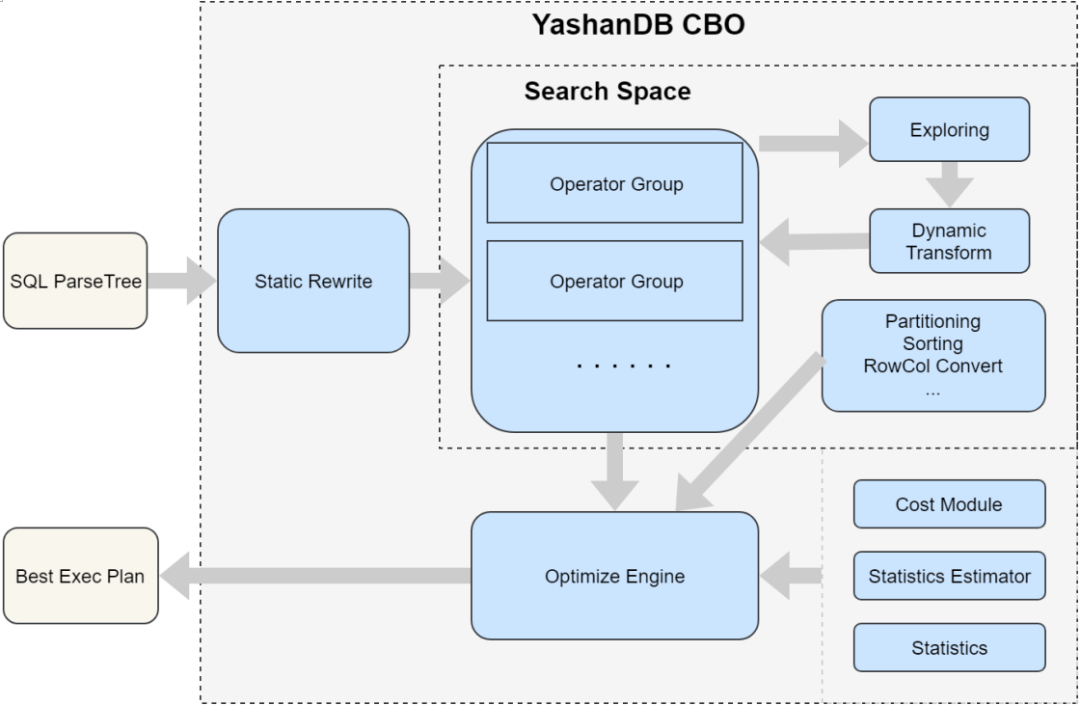 YashanDB动态优化部分基于Cascades框架设计构建,该框架可以较好的实现器各模块解耦,例如路径搜索与统计信息和Cost模型的解耦、查询重写规则与逻辑算子和物理算子的解耦等,路径扩展与最佳路径搜索的解耦等,通过各个模块的解耦,实现在任何模块都可以快速的增加开发一些新的功能的能力,比如可以快速增加一个物理算子,可以快速的增加一个查询重写的规则。