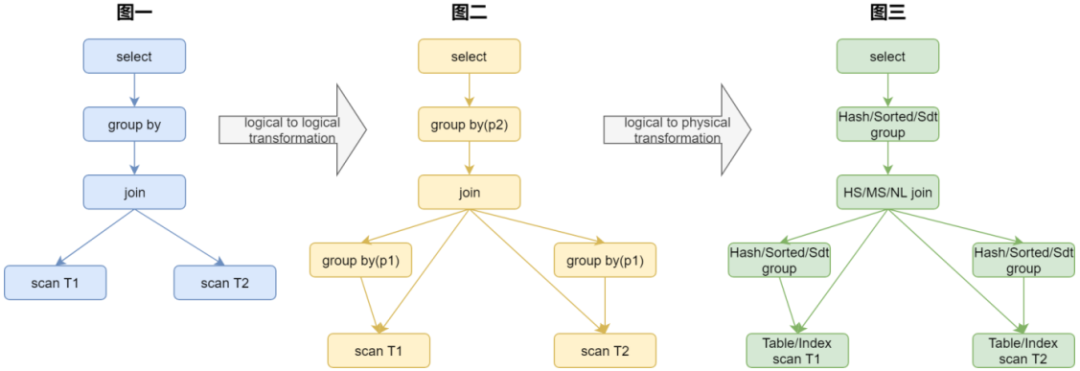 SQL语句经过Parse后生成抽象表达树,在进入到CBO后,根据SQL的语义,生成一个初始的逻辑执行树。从而初始化搜索空间,语句在CBO框架中的表示如图一。 接着进行逻辑转换,根据重写规则,扩展出更多的等价形式。该语句group by t1.id命中Group By下推的重写条件,所以根据动态重写规则,会生成一个额外的路径,将Group By下推到Join下面,t1表的Scan之后,表示如图二。 在该语句中,由于存在Join条件t1.id = t2.id, 所以Group By t1.id也可以等价表示为Group By t2.id,所以还会额外的产生一个Group By下推到join下面t2的Scan之后的计划。所以就有了Group By下推到t1表,Group By下推到t2表下面的额外路径产生。 逻辑转换阶段结束后,进入物理转化阶段,根据逻辑算子,产生相关的物理执行算子。在YashanDB数据库中,Group By的物理算子实现了Hash Group,Sorted Group和Sdt group,这样在每个阶段的Group操作,都会产生3个物理Group的路径,表示如图三。 Scan会根据表和表上的索引,产生相关的Table Scan,Index Scan等物理执行计划。