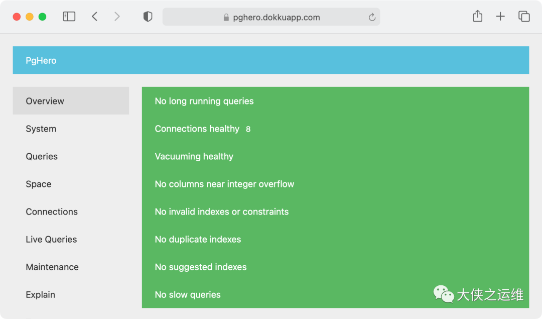 PgHero是一个用于监控PostgreSQL性能的开源工具,它提供了直观、易懂的仪表板,帮助开发者实时追踪数据库的性能状况。无论是查询性能、空间占用还是连接数,PgHero都能提供详尽的信息,帮助开发者快速发现并解决潜在问题。