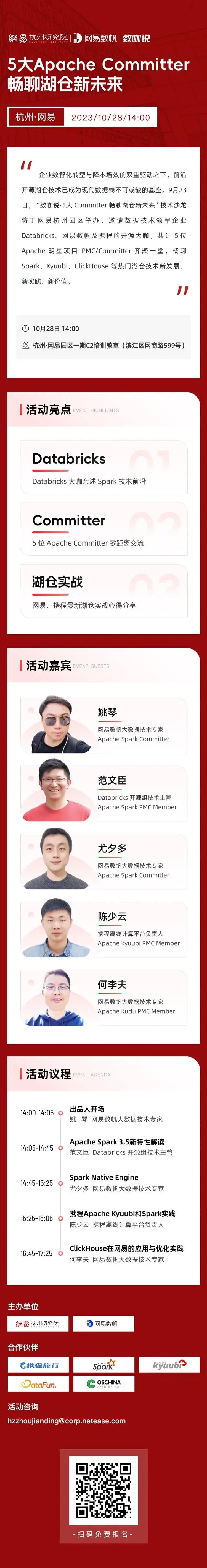 10月28日,网易杭州研究院、网易数帆将于网易杭州园区举办“数咖说·5大 Committer 畅聊湖仓新未来”技术沙龙,邀请数据技术领域领军企业Databricks、网易数帆及携程的实战大咖襄助,共计 5 位 Apache 明星项目 PMC/Committer齐聚一堂,畅谈 Spark、Kyuubi、ClickHouse 等热门湖仓技术新发展、新实践、新价值。
