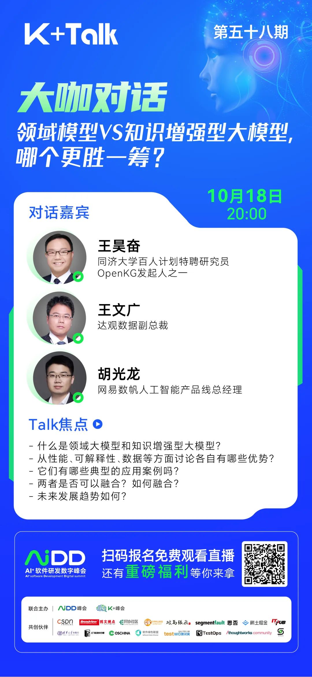 10 月 18 日 20:00,K+Talk 大咖对话,网易杭州研究院、网易数帆双料 AI 负责人胡光龙受邀作为对话嘉宾,共同探讨“领域模型 VS 知识增强型大模型,哪个更胜一筹?”