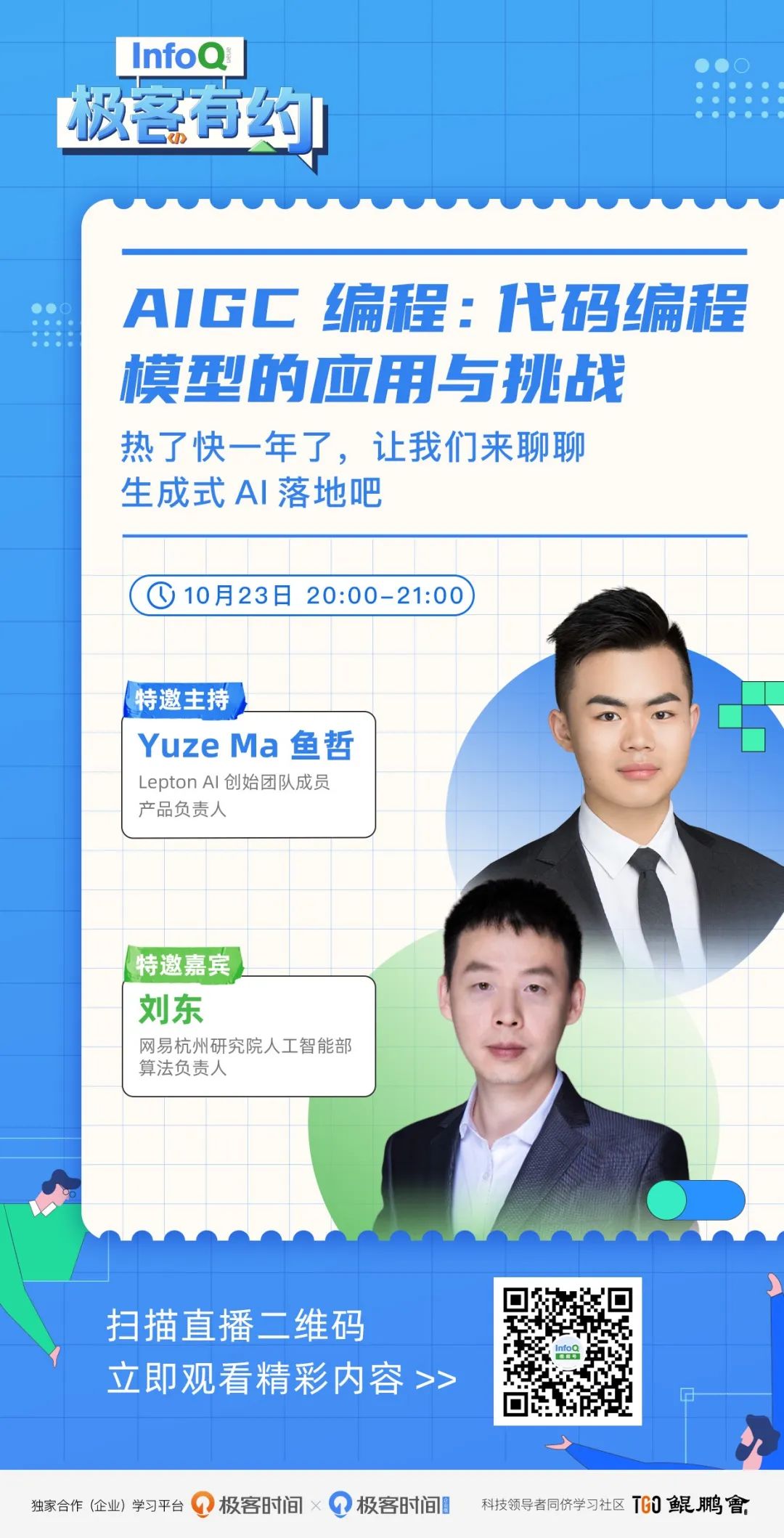 10 月 23 日 20:00-21:00,网易杭州研究院人工智能部算法负责人刘东做客 InfoQ 极客有约,畅聊“AIGC 编程: 代码编程模型的应用与挑战”。