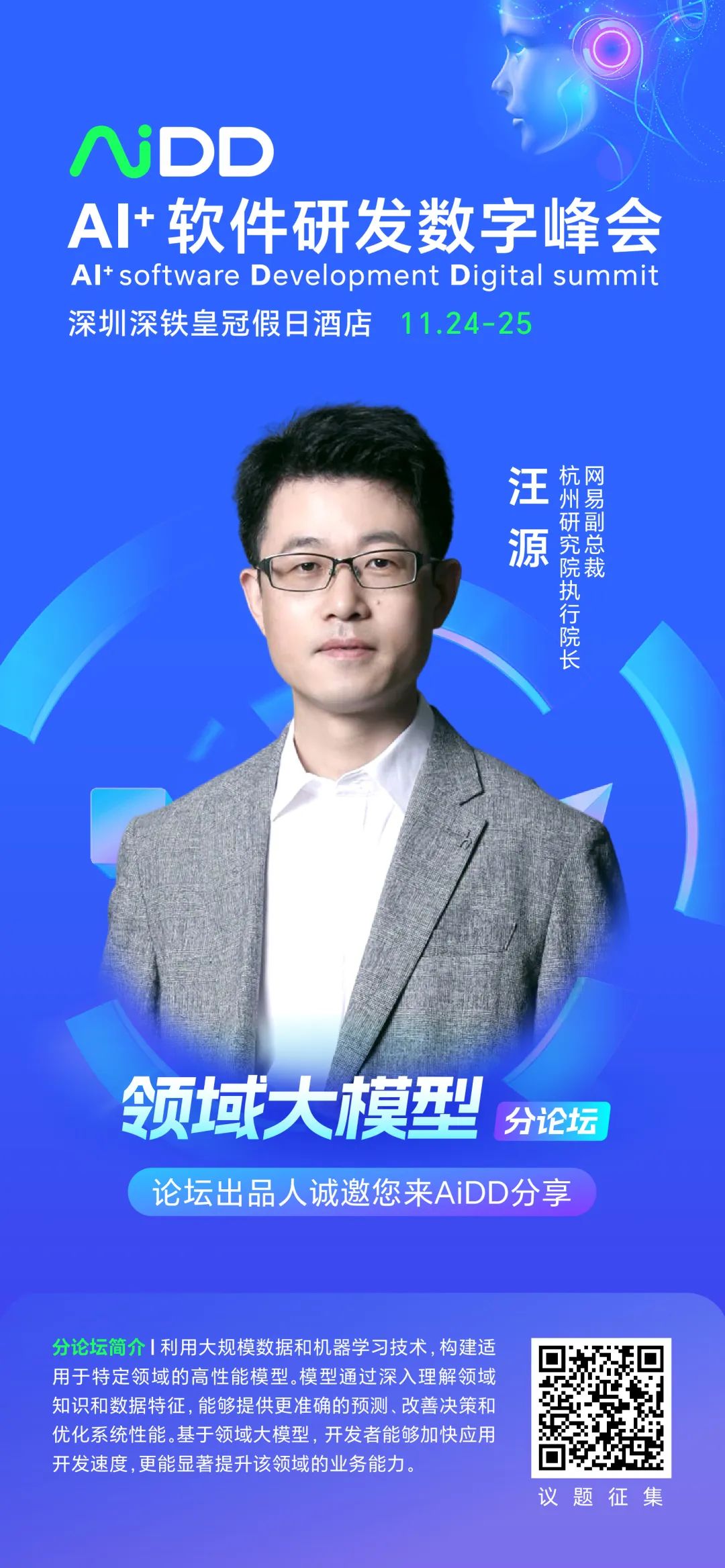 11 月 24-25 日,AI+软件研发数字峰会(AiDD)深圳站举办,网易副总裁、网易杭州研究院执行院长汪源受邀作为领域大模型分论坛出品人。