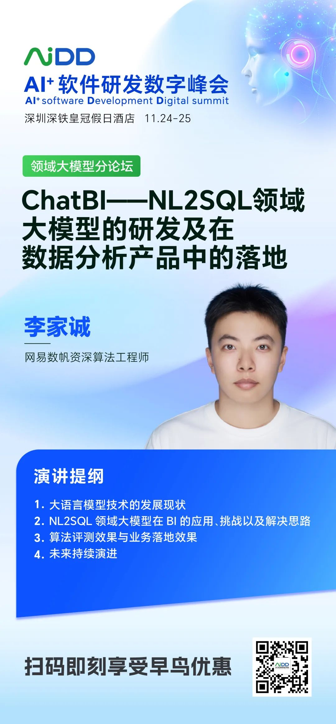 在这一分论坛,网易数帆资深算法工程师李家诚将带来主题为“ChatBI--NL2SQL 领域大模型的研发及在数据分析产品中的落地”的分享。