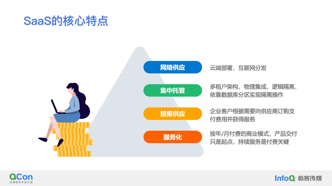 我们来简单回顾一下SaaS应用具备的基本特点。这里有四个关键点: