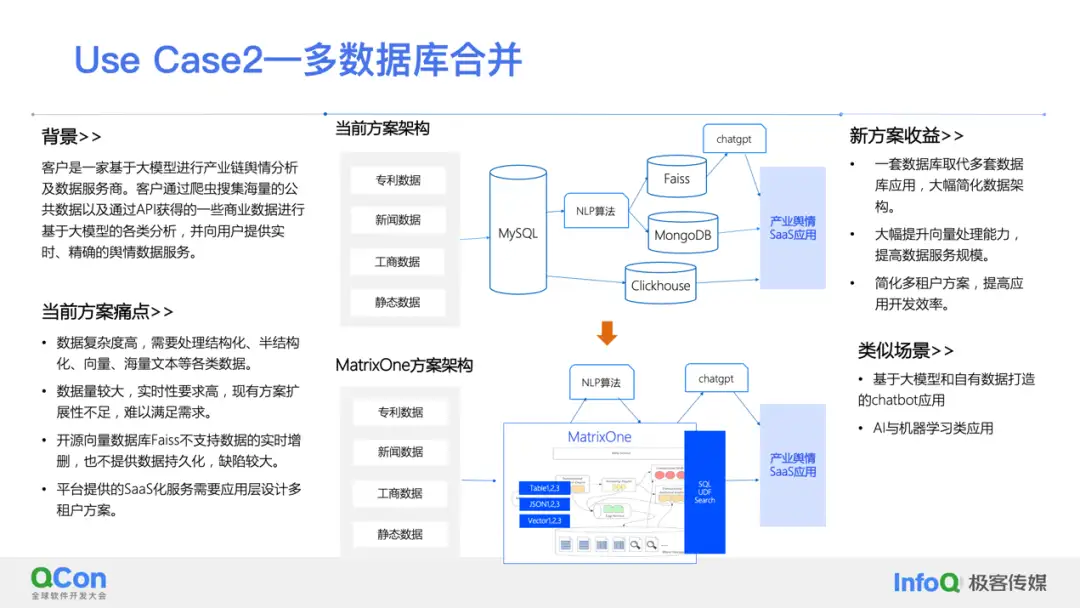 另外一个案例相对比较新,这是一个SaaS平台,基于大模型做数据服务。该平台利用公网上的大量数据,包括新闻和其他公开数据,提供舆情相关应用并为企业客户提供分析服务:会分析哪些新闻有利于客户,哪些不利于客户。该平台采用了一套复杂的数据架构。首先,他们将所有数据存储在MySQL中,这是主数据库。然后,他们使用自己开发的NLP算法来提取文本相关的信息,并将其转化为向量。这些向量被存储在一个开源的Faiss向量数据库中。此外,该应用还产生了一些半结构化的数据,这些数据被存储在MongoDB中。该平台还需要实现报表和统计相关的分析功能,因此他们还引入了ClickHouse。此外,还需要使用ChatGPT相关的接口来控制整个链路。最后,由于平台需要文本搜索和图计算能力,还加入了ElasticSearch和Neo4j。虽然该团队不到5个人,但是他们用了超过5个数据库组件,因此维护该系统变得非常困难。但是,如果采用MatrixOne,可以将MySQL、ClickHouse、MongoDB和Faiss的能力全部统一到一个数据库中,从而快速打造一个大型模型相关的应用。