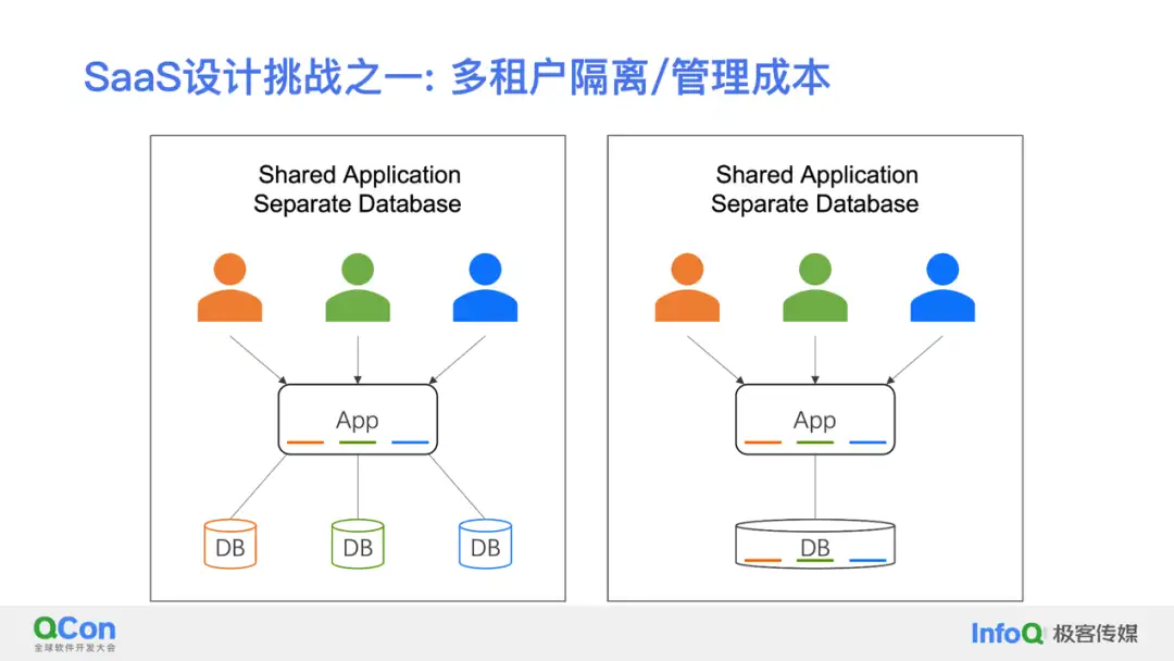 第一个问题是关于SaaS面临的挑战,即如何在数据层面实现多租户的隔离。通常来说,有两种核心选择方式:每个租户独占数据库实例,或多租户共享数据库实例,或介于两者之间。
