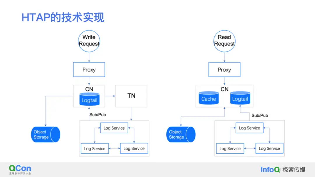 我们的核心思想是有效拆分读写操作。对于写操作,我们将其处理过程几乎等同于处理TP问题。具体来说,当写入请求到达CN节点时,CN节点会将数据传递给TN节点。TN节点进行事务相关的判断,比如判断多个客户端写入的先后顺序,确定哪些需要等待,哪些可以立即写入。然后TN节点会将这些数据存储在我们的Log Service上,也就是说所有新写入的数据都会保存在这个位置,我们称之为LogTail。这些数据会被重新同步到服务查询的CN节点的内存中。因此,CN节点在处理查询时可以快速从缓存中找到相应的数据。