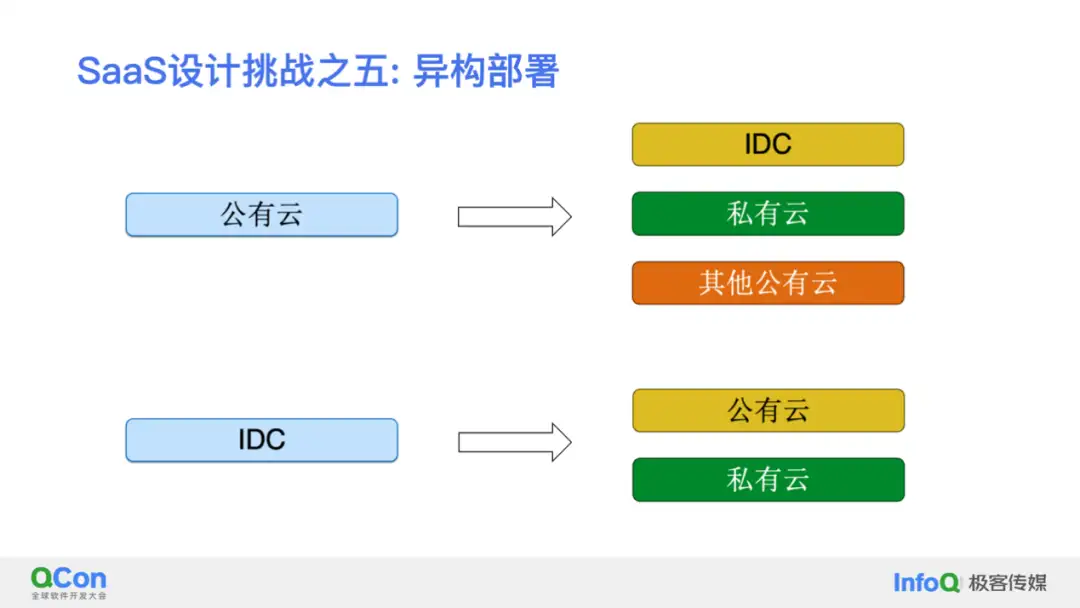 第五个是异构部署。虽然对于SaaS来说,大家普遍认为应该放在公有云上,但在中国可能并非完全如此。实际上,我见过很多SaaS企业最初都是基于公有云的,但某些时刻它们会接到一些政企大客户的要求,这些客户通常需要私有化部署,而我们常说的企业级大客户则需要保证敏感数据的安全性。这时情况就变得有些棘手了,因为所有有用的东西、组件和整个工具链都在云上。若现在要进行私有化部署,就需要涉及到许多细节问题,例如如何将依赖于云的组件下放到本地环境中等等。