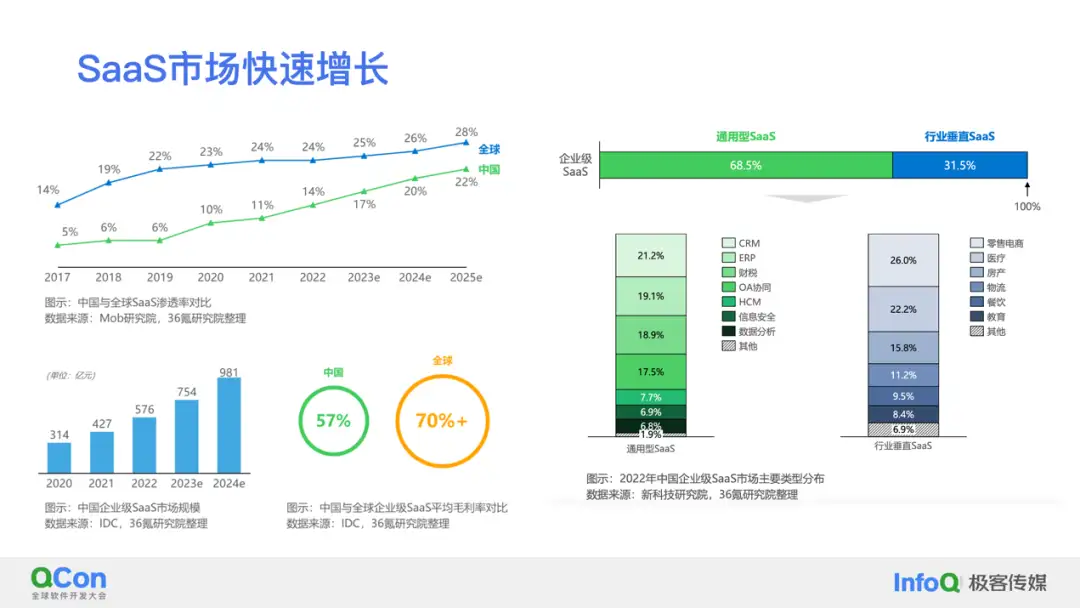 在技术层面上,国内企业与全球化的SaaS企业之间存在一些差距。例如,在数据处理方面,国内许多行业垂直类的SaaS(如制造、能源、交通等实体行业)面临着巨大的数据压力,但目前的处理方案并不能很好地解决它们的问题,只能勉强应对。这实际上也是整个SaaS市场普遍存在的情况。