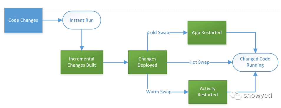 Instant Run目前只检测主进程,所以如果你的APP有多个进程,在其他进程上的Hot Swap和Warm Swap将会降级为Cold Swap,或者当你的API级别低于21时,会变成全量build