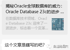 今天下午一个国产数据库厂家的朋友给我转发了一篇关于Oracle 23c分布式数据库的文章。他看了以后觉得在分布式数据库上 Oracle 似乎一下子变得很强大了,因此他有点怀疑这篇文章所述内容的真实性。