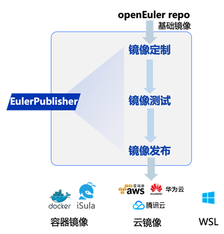 EulerPublisher作为“一键式”自动构建、测试和发布openEuler镜像的工具链,可以对接AWS、华为云、腾讯云、阿里云等主流公有云平台,以及Docker Hub等主流容器镜像仓库,极大地提升openEuler镜像发布效率,降低用户获取和体验openEuler的门槛。