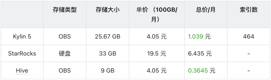 Kylin 存储成本低于 Starrocks(存储成本降低 600%)。