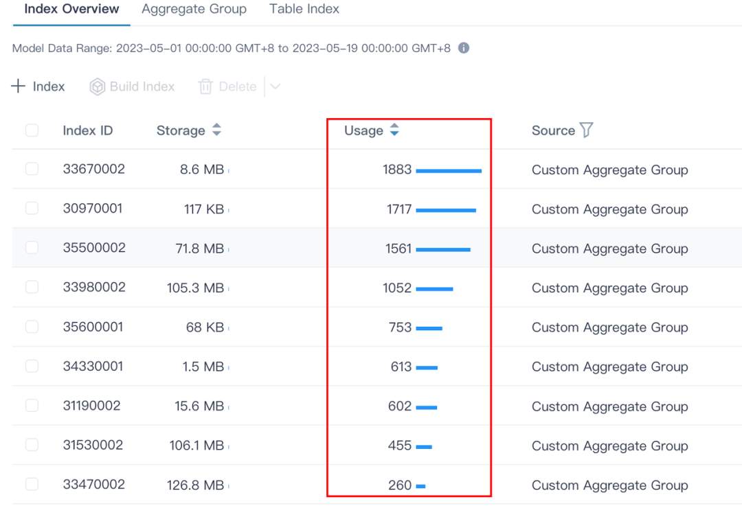 Kylin 会记录任何命中索引的查询,异步更新到索引的 Usage 属性中。用户可以根据 Usage 属性判断索引使用的频率,从而适当的裁剪或新增索引,提高查询效率或节省存储成本。