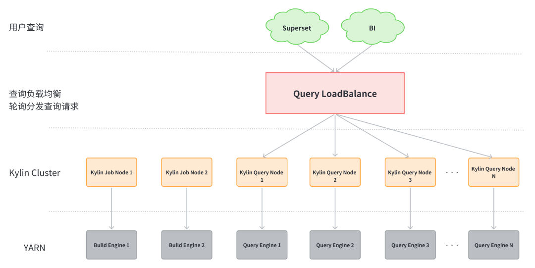 所有查询入口均访问 LoadBalance 节点,LoadBalance 轮询分发查询到不同 Kylin 查询节点,即可实现查询节点高可用。