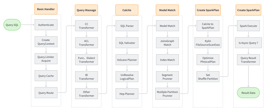 切出两个 OLAPContext 后,Kylin 会将这俩 OLAPContext 分别拿去做 Model 匹配和 Index 匹配。没匹配到,就换继续切,最终还是没匹配到合适 Model 和 Index,就会把 SQL 丢给 Spark 做下压查询。如果匹配到了合适的 Model 和 Index,就会将 CalcitePlan(逻辑计划) 转化为 SparkPlan(物理执行计划) 后执行。
