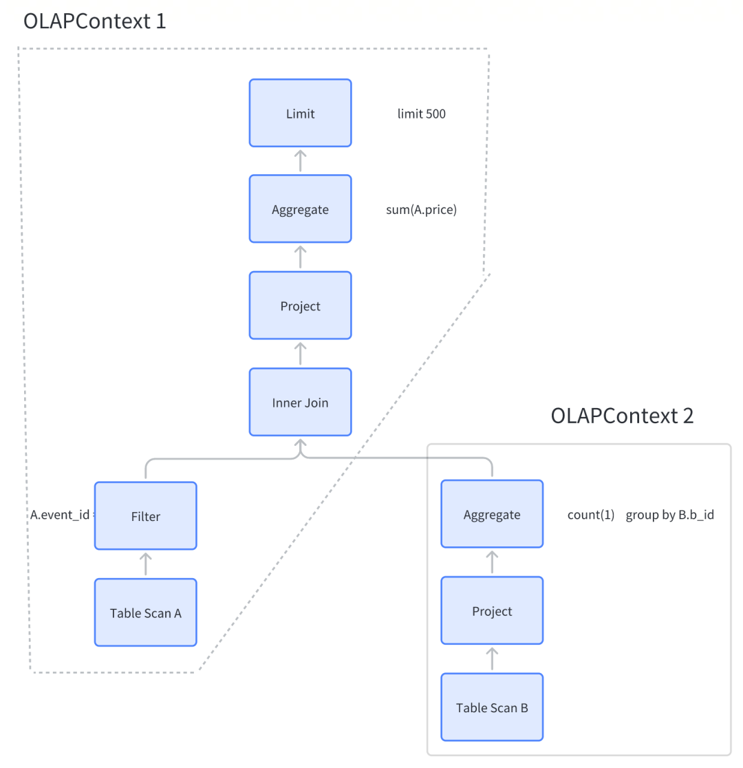 OlAPContext 的切分规则是:用 RelNode Visitor 深度优先访问 RelNode,一旦遇到 Aggregations 就切分一个 OLAPContext。