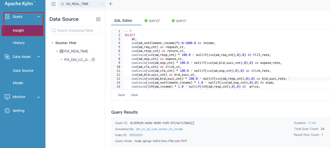 Kylin 5 的即席查询能力(查询下压),利用其在 Yarn 上的常驻 Spark 任务,Kylin 将用户提交的 SQL 直接丢给 Spark 进行查询。