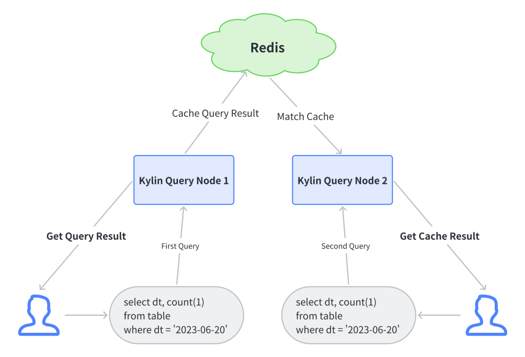 分布式缓存:数据缓存在 Redis 中,当部署了多台 Kylin 节点时,一台节点的缓存对另一台节点可见。使用分布式缓存可以避免大多数重复计算,节省资源,提高查询速度。