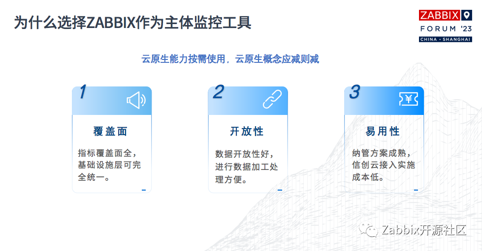 第二,开放性。我认为这对我们至关重要。因为各种云厂商的数据开放性相对较差,我们要集成它们的数据,需要很大的精力与他们沟通。Zabbix采用我们的代理采集方式,我下面有张图会重点介绍。对于我们来说,数据集成方法无需担心,而且与传统监控可以融合。