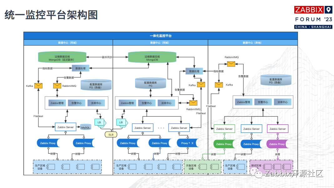 这张图展示了我们内部的大致监控架构图。今年我们增加了一套松江的信创云的数据环境,基本上架构可以不动,仍然沿用原来的架构。另外一块是关于数据开放性,我们已经在Zabbix Proxy层和server层进行了实施。