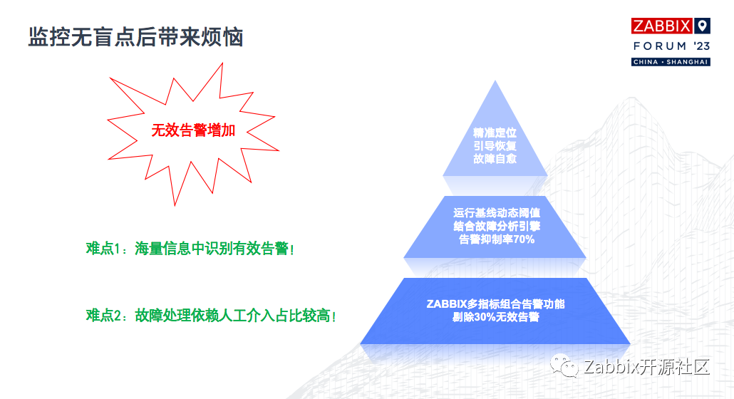 首先,我们现在的环境变得更加优越,监控手段也增加了。我们刚才也看到了,从上到下我们有好几套与监控相关的产品,目前的监控覆盖面大了之后将会出现无效告警,这是一个严重的问题,每种监控类型都会出现。