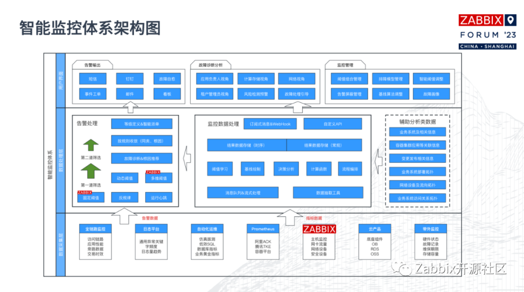 最后一部分可能会超出Zabbix的范围体系。在这次范围体系中,我们在智能监控体系建设中的一些内容。Zabbix数据的运用可能与其自身能力有关,主要是基于指标数据进行了一些衍生的高阶开发。这一块在过去两年中也是我的重点工作中心。