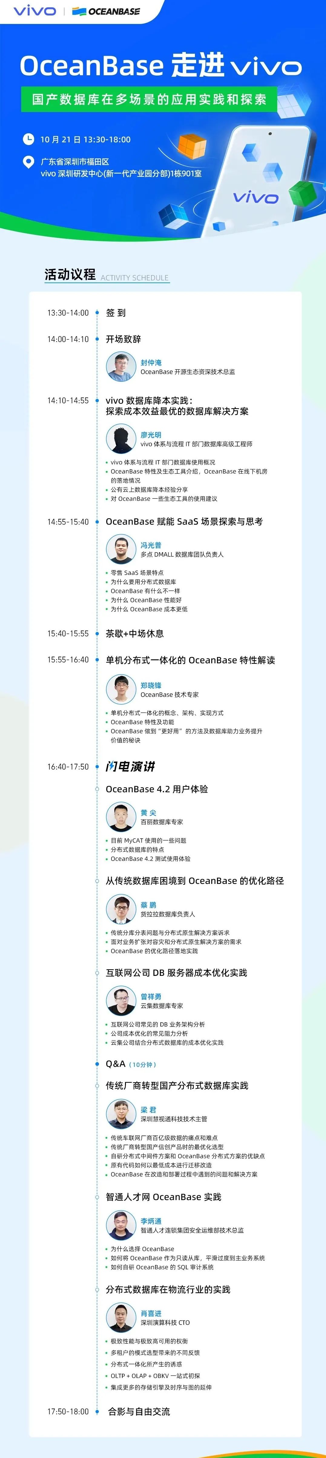 10 月 21 日,OceanBase 社区将走进 vivo,与数据库技术爱好者共聚深圳,开展主题为《国产数据库在多场景的应用实践与探索》的技术实践交流活动 ,探讨国产数据库在不同行业、不同企业、不同应用场景下的实践经验和发展前景。