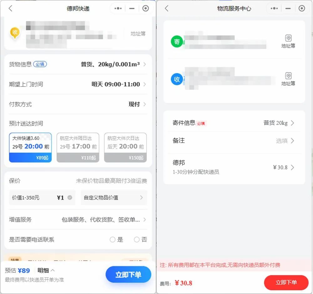 20kg快递费用对比,德邦找快递员下单需要89元,用奇点递低价寄快递公众号下单,只需要30元!直接少59元!