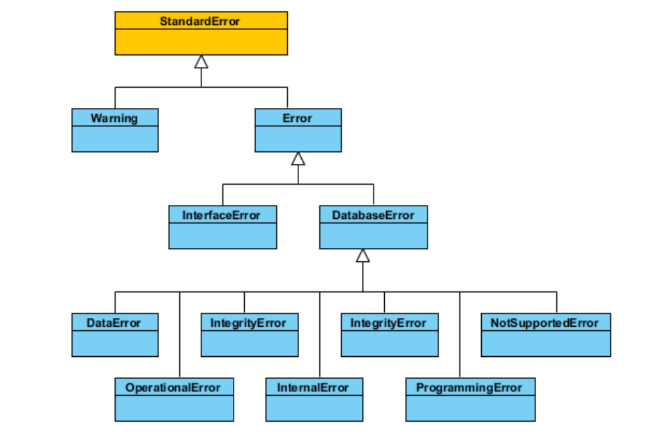 接口将所有异常处理类全部封装到了 GBaseError.py 文件中,所以当引用 这些异常类时需引用 GBaseError.py 文件。所有的错误、异常、警告等内容的 错误处理全部经由此文件中的类完成。下图为所有异常类继承关系图。