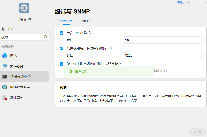2、打开TNAS,进入控制面板的【终端与SNMP】,开启SSH访问,系统默认端口为9222,你也可以自行设置,点击应用,即设置成功;