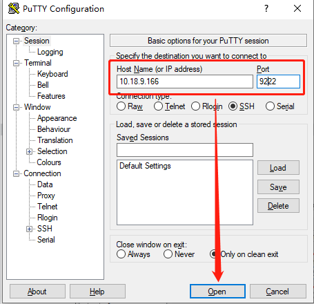 3、在电脑上运行putty,在Host name栏输入TNAS的IP地址,在Port栏输入9222或你设置的端口号,点击Open;