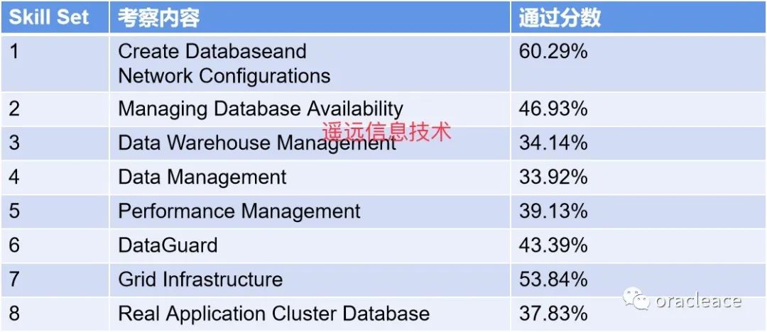 12c有8个Skill Set,19c有4个Module,每个部分都有最低分数要求,考试需要通过所有的Skill Set或者Module才能通过OCM的考试,因此19c的OCM实际比12c更容易,因为计分单位减少了一半。