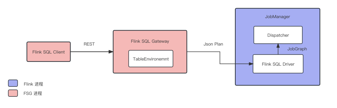 对于 Flink Session 模式或者 Per-Job 模式而言,前 3 个步骤均在 Flink Client 端的 TableEnvironment 完成,而且编译产出的 JobGraph 可序列化并包含全部作业信息,因此十分适合用于划分 SQL 网关和 Flink 集群的界限。换句话说,网关完成 SQL 解析、优化、编译之后,将 JobGraph 以 REST 或提交到 HDFS/S3 等分布式存储即可。