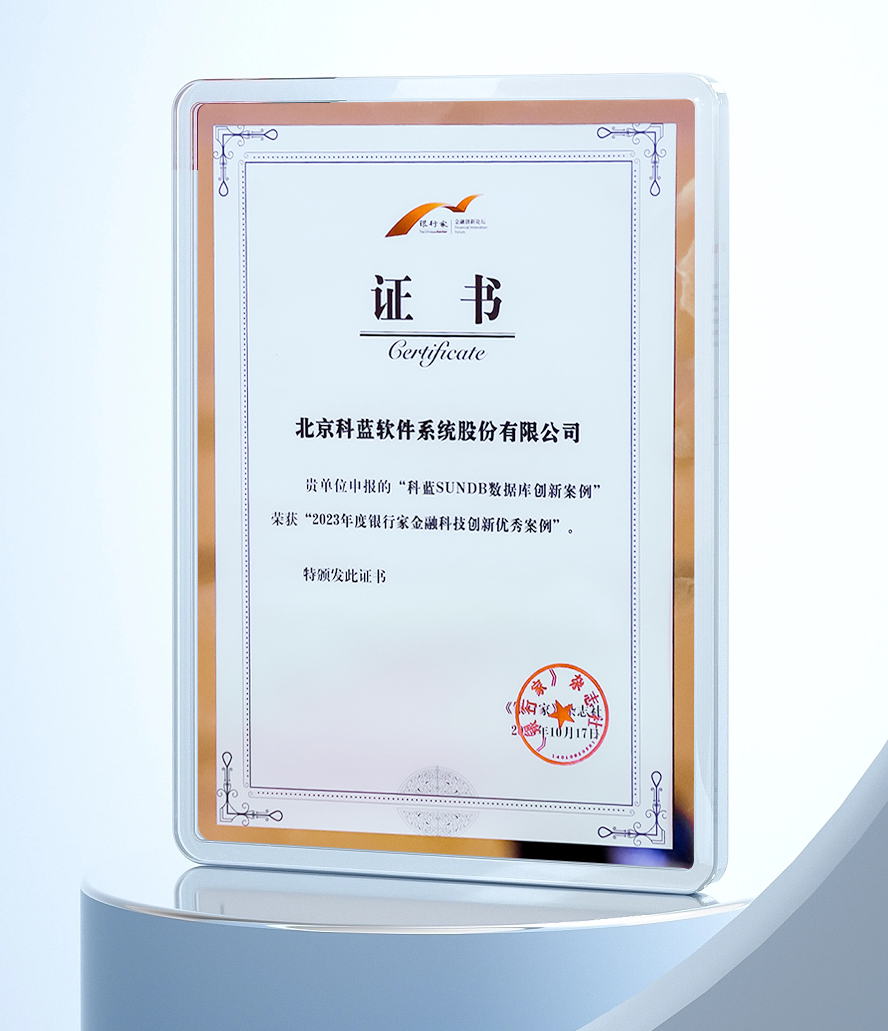 在本次金融创新成果发布会上,科蓝软件SUNDB数据库以其卓越的性能和大量金融级可验证案例,荣获年度金融科技创新优秀案例奖。