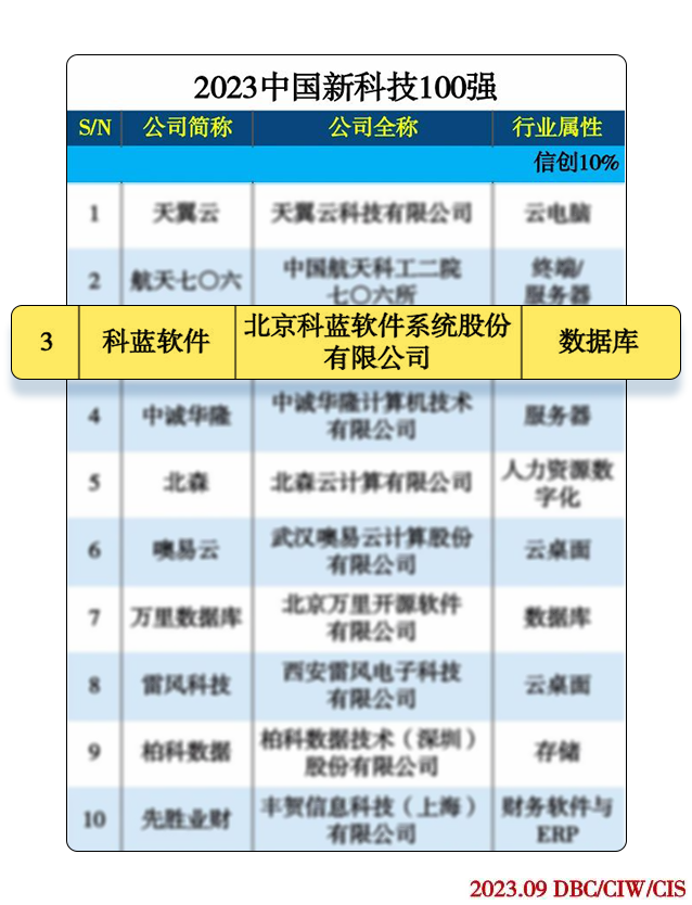 近日,由中国科学院《互联网周刊》、中国社会科学院信息化研究中心、eNet研究院、德本咨询联合发布了“2023中国新科技100强”榜单,科蓝软件凭借完全自研的SUNDB中国数据库在金融、电信、电力、国防等国家关基领域的应用,荣登该榜单。