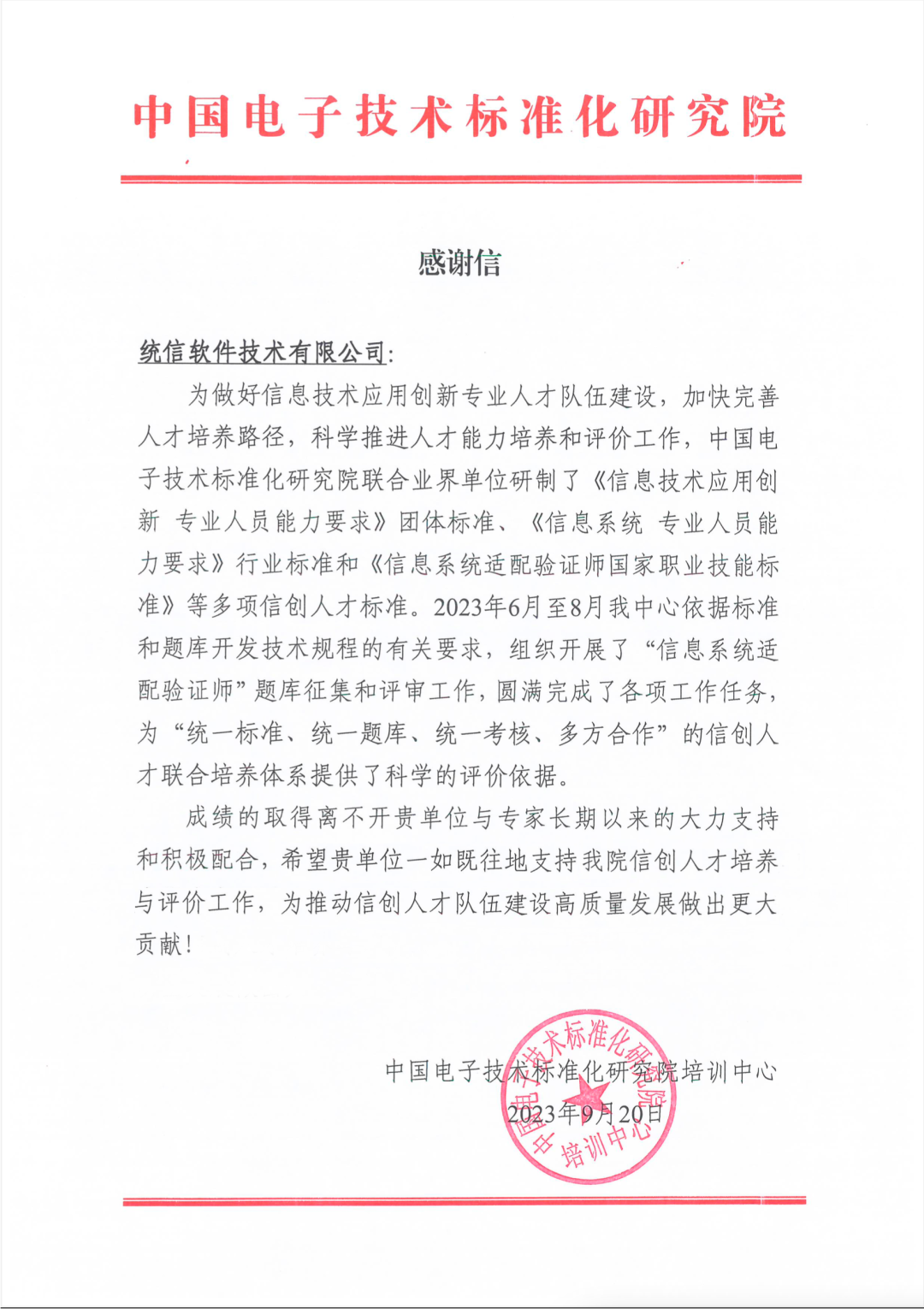 日前,统信软件收到了中国电子技术标准化研究院的感谢信,对统信软件在参与标准制定过程中所做出的突出贡献予以肯定。