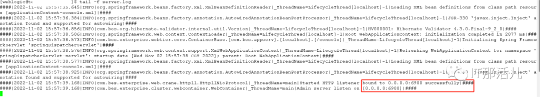 2)当日志的出现 started http listener bound to 0.0.0.0:6900successfully/home/weblogic/BES952/AdminServer/logs/server.log