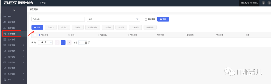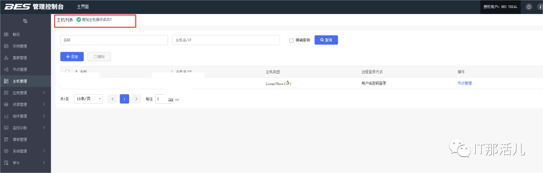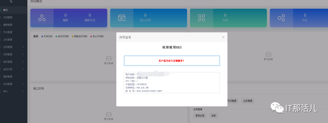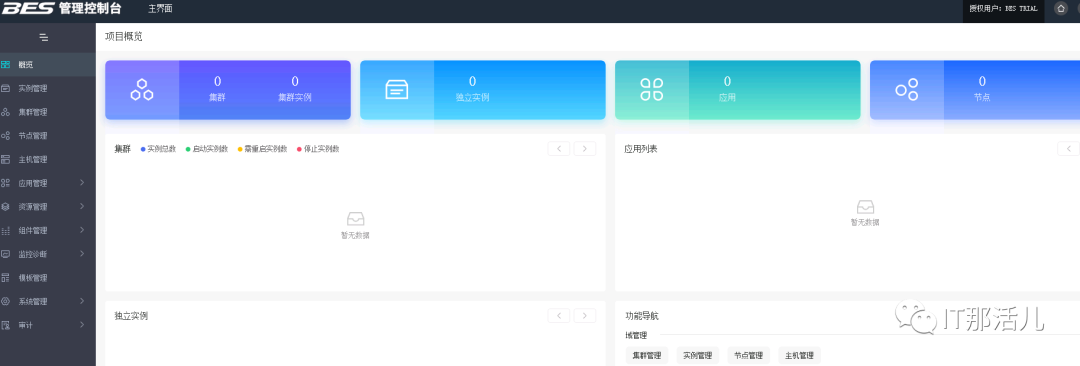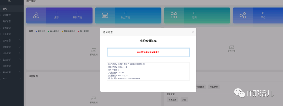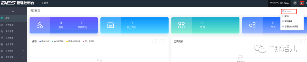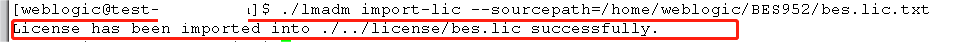 3)进入管理服务控制台主界面,在主界面可以看到项目概览:集群、应用列表、独立实例、功能导航1)宝兰德介质自带的 license 是试用 License,实际情况以控制台中许可证书时间为准生产环境安装好之后就需要向宝兰德销售经理联系,获取正式授权许可文件之后导入到产品种,在测试环境中若中间件介质自带的 license 到期,需向宝兰德销售获取最新的 license。以下图中显示的情况为例,如 license 未到期,则可以忽略以下认证步骤,直接进行主机配置。2)进入宝兰德中间件执行命令目录下/home/weblogic/BES952/AdminServer/bin,执行认证命令./lmadm import-lic --sourcepath=/home/weblogic/BES952/bes.lic.txt