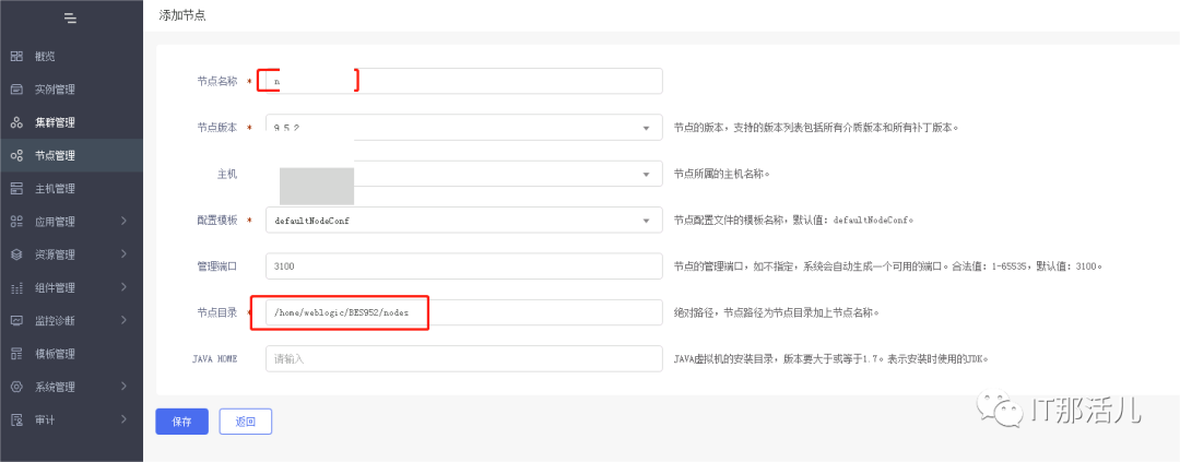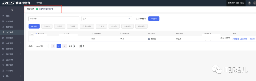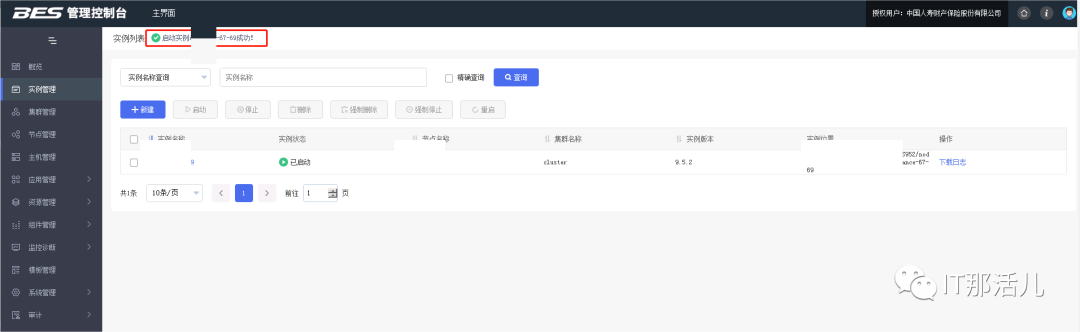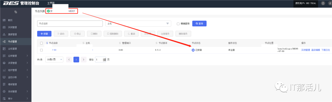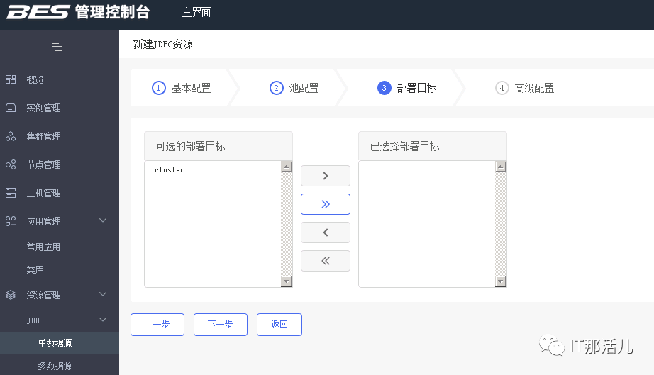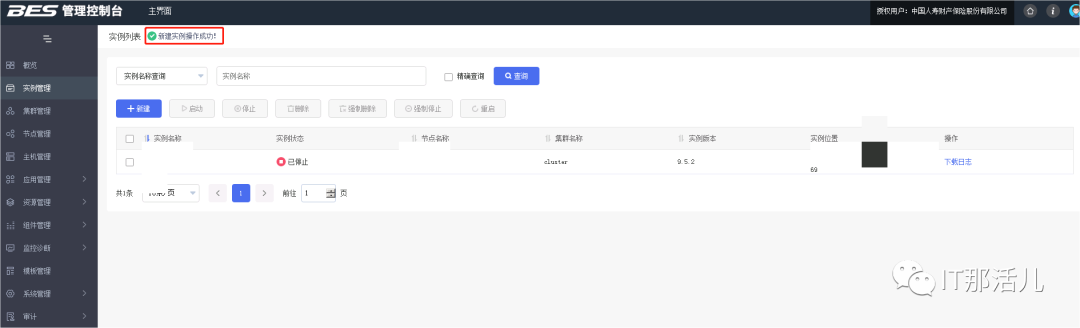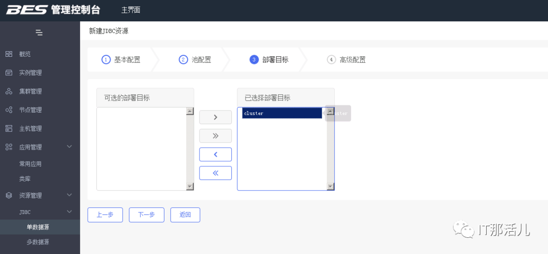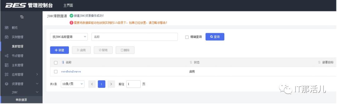 1)在左侧菜单中点击“主机管理”,进入主机列表界面3)在主机信息界面:输入服务器名称、主机名/IP,选择操作系统、远程登录方式,输入 SSH 端口、操作系统的用户名与密码,点击保存4)在主机列表后, 出现“增加主机操作成功”,表示配置主机成功1)在左侧菜单中点击“节点管理”,进入节点列表界面3)输入节点名称(建议使用 node-ip),选择节点名称、主机 IP,输入节点目录:/home/weblogic/BES952/nodes,点击保存4)在节点列表后,出现“新建节点操作成功”,表示配置节点成功选中节点名称,点击“安装”按钮,在弹出的提示小窗口中,点击确定,开始安装节点:6)节点安装成功后,在节点列表后,出现“安装节点成功”,节点状态为“已安装”,表示节点安装成功选中节点名称,点击“启动”按钮,在弹出的提示小窗口中,点击确定,节点服务开始启动。8)节点列表后,出现“启动节点成功”,节点状态为“已启动”,表示节点已启动完毕建议名称:cluster-ip(服务器 IP 最后一位),保存。4)在集群列表后,出现“新建集群操作成功”,表示配置集群成功1)在左侧菜单中点击“实例管理”,进入实例列表界面2)在实例列表界面,点击“新建”按钮,进入实例配置界面输入实例名称,选择实例版本、实例类型、集群、节点,点击保存。4)在实例列表后,出现“新建实例操作成功”,表示实例配置完毕选中实例名称,点击启动,在弹出的提示小窗口中,点击确定,开始启动实例。6)在实例列表后,出现“启动实例成功”,并且状态为“已启动”,表示实例启动成功1)在配置数据源前,需要把数据库的驱动包,放在实例的 lib 下面/home/weblogic/BES952/nodes/node-1/instances/instance-1/lib