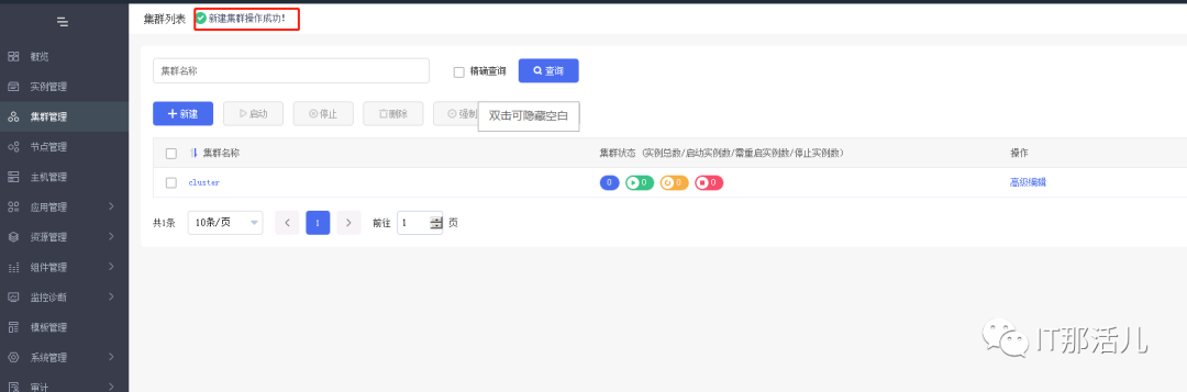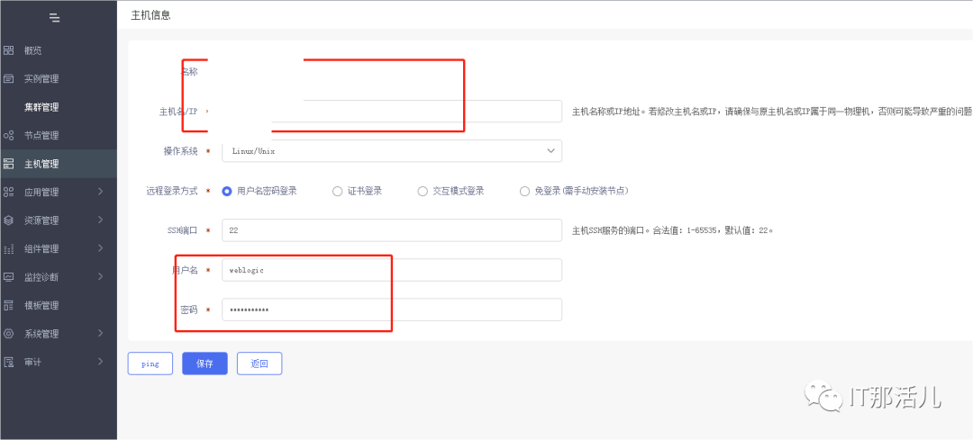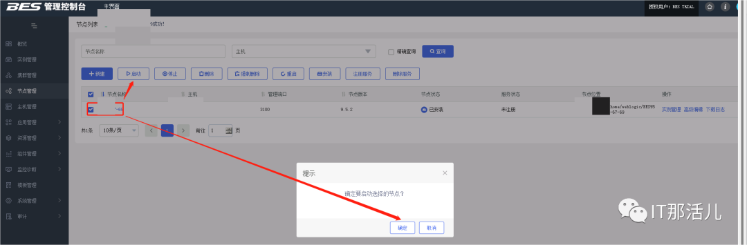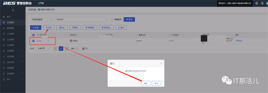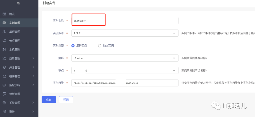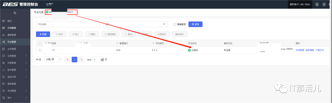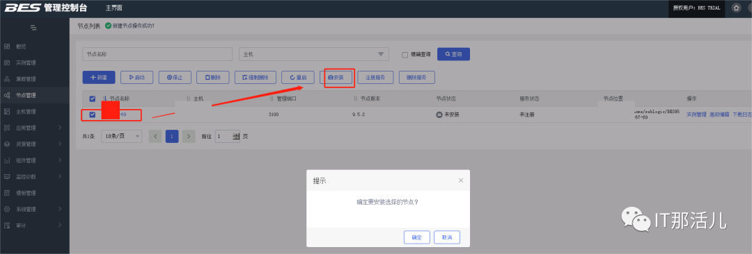 1)在左侧菜单中点击“主机管理”,进入主机列表界面3)在主机信息界面:输入服务器名称、主机名/IP,选择操作系统、远程登录方式,输入 SSH 端口、操作系统的用户名与密码,点击保存4)在主机列表后, 出现“增加主机操作成功”,表示配置主机成功1)在左侧菜单中点击“节点管理”,进入节点列表界面3)输入节点名称(建议使用 node-ip),选择节点名称、主机 IP,输入节点目录:/home/weblogic/BES952/nodes,点击保存4)在节点列表后,出现“新建节点操作成功”,表示配置节点成功选中节点名称,点击“安装”按钮,在弹出的提示小窗口中,点击确定,开始安装节点:6)节点安装成功后,在节点列表后,出现“安装节点成功”,节点状态为“已安装”,表示节点安装成功选中节点名称,点击“启动”按钮,在弹出的提示小窗口中,点击确定,节点服务开始启动。8)节点列表后,出现“启动节点成功”,节点状态为“已启动”,表示节点已启动完毕建议名称:cluster-ip(服务器 IP 最后一位),保存。4)在集群列表后,出现“新建集群操作成功”,表示配置集群成功1)在左侧菜单中点击“实例管理”,进入实例列表界面2)在实例列表界面,点击“新建”按钮,进入实例配置界面输入实例名称,选择实例版本、实例类型、集群、节点,点击保存。4)在实例列表后,出现“新建实例操作成功”,表示实例配置完毕选中实例名称,点击启动,在弹出的提示小窗口中,点击确定,开始启动实例。6)在实例列表后,出现“启动实例成功”,并且状态为“已启动”,表示实例启动成功1)在配置数据源前,需要把数据库的驱动包,放在实例的 lib 下面/home/weblogic/BES952/nodes/node-1/instances/instance-1/lib
