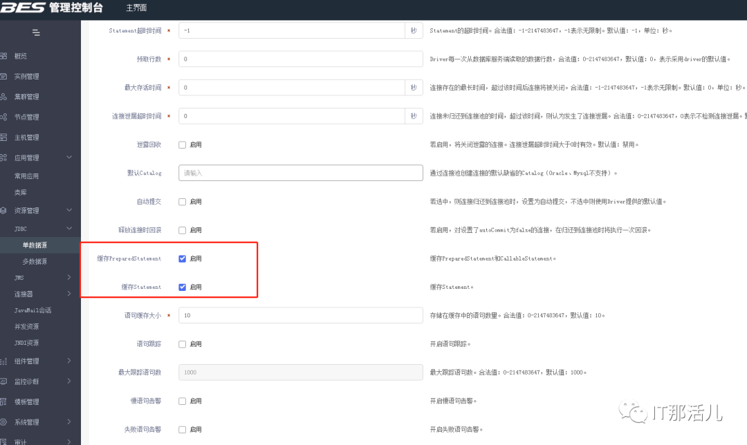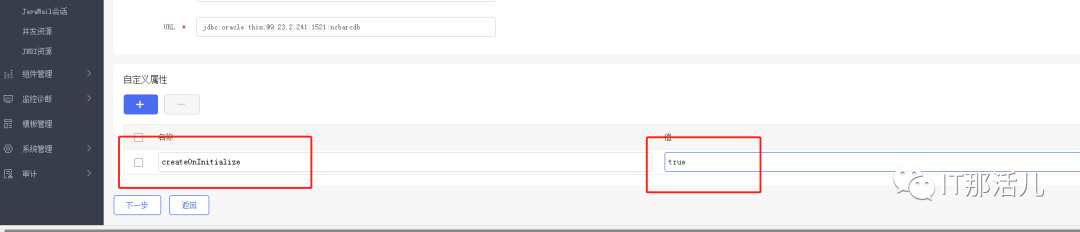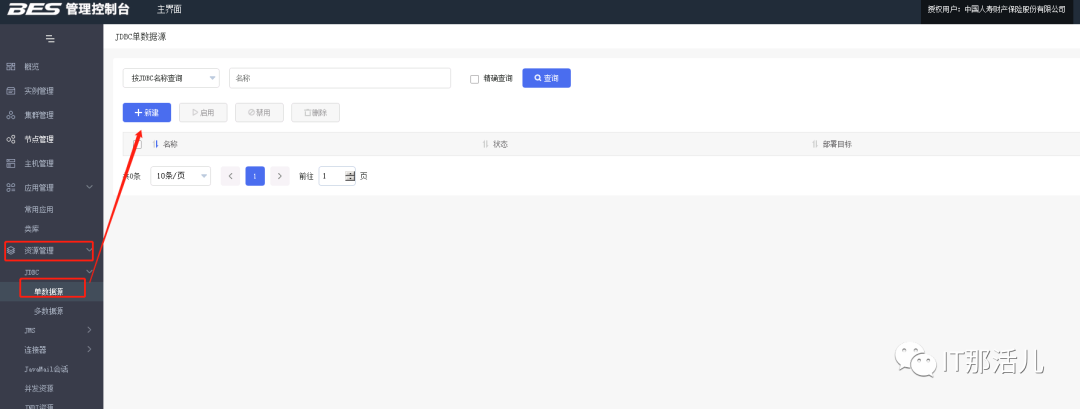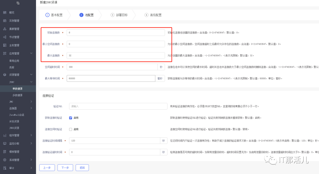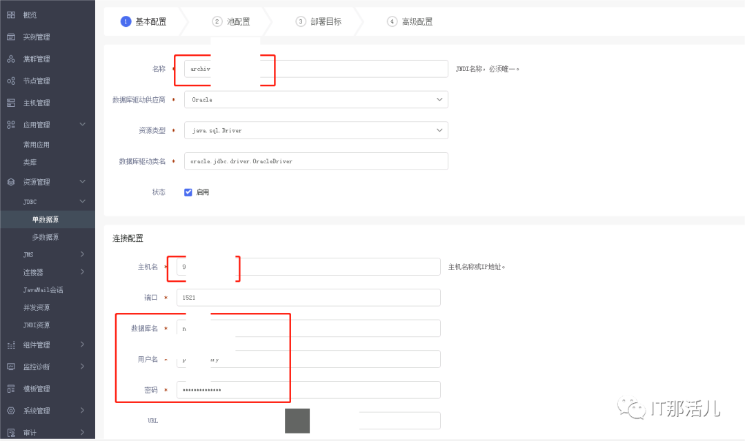 3)在左侧菜单中点击“资源管理”,点击“JDBC”,点击“单数据源”,进入 jdbc 单数据源界面4)在 jdbc 单数据源界面中,点击“新建”按钮,进入数据源配置界面5)在 jdbc 配置界面中,输入名称、选择数据库驱动、数据库 IP、数据库名称、用户名、密码,输入完毕后,检查一遍,确认无误后,点击下一步7)根据项目所需,输入初始化连接数、最小空闲连接数、最大连接数,空闲超时时间输入验证 SQL:select 1 from dual,点击下一步。9)部署目标出现在“已选择部署目标”,完成部署目标选择,点击下一步10)把自动提交和释放连接回滚后面方框中的对勾去掉,把缓存 PreparedStatement 和缓存 Statement 后面方框中的对勾选上,点击保存11)JDBC 单数据源后面出现“新建 JDBC 资源操作成功”,表示数据源配置成功