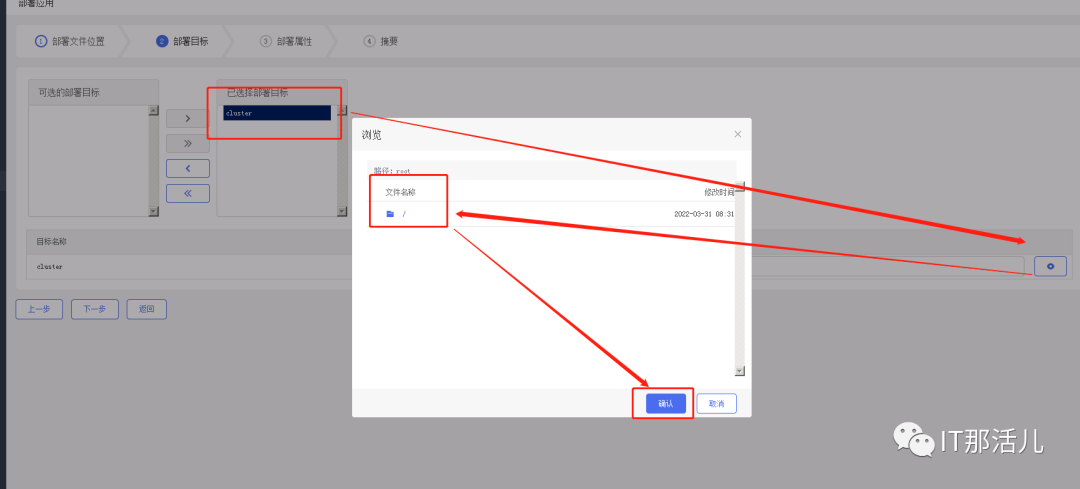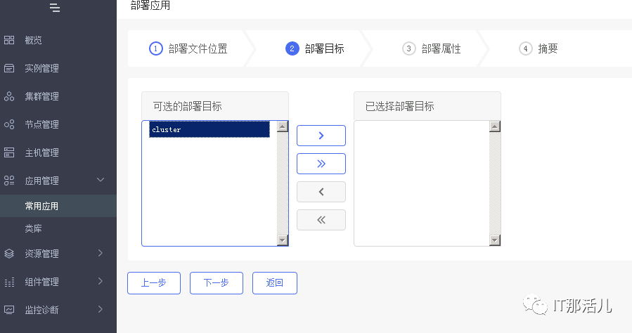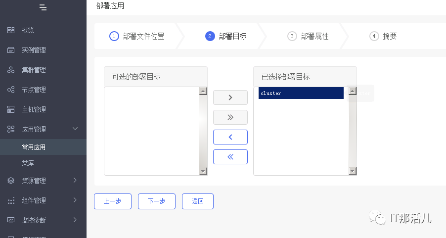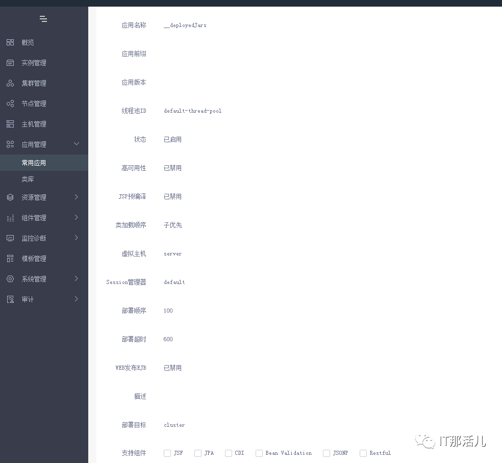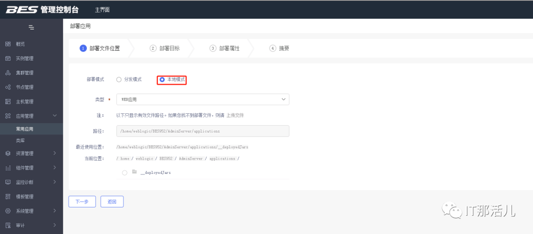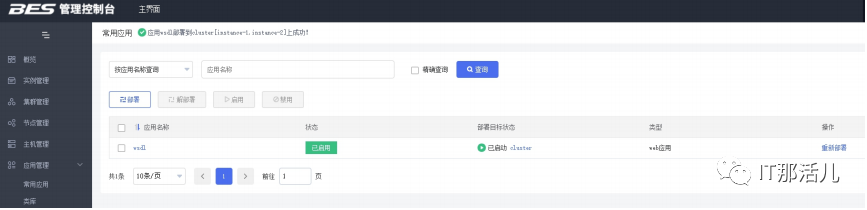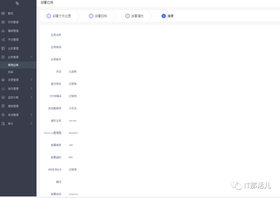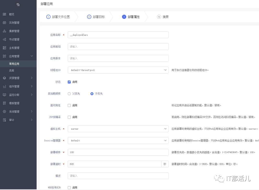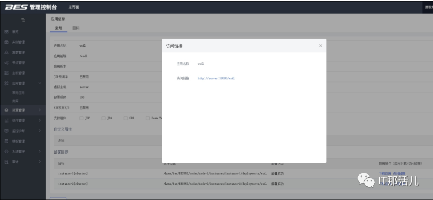 1)在左侧菜单中点击“应用管理”,点击“常用应用”,进入常用应用界面如部署 web 应用,请在类型处选择“web 应用”,然后在路径处,输入 web 应用的路径及名称。5)部署目标出现在“已选择部署目标”,完成部署目标选择,点击下一步8)在常用应用后,出现“应用部署成功”,表示 Web 应用部署成功9)点击应用名称,进入应用信息页面,查看应用访问链接10)点击访问连接,把访问链接复制至新的浏览页中,然后把 server 修改为服务器 IP,回车即可访问应用1)在左侧菜单中点击“应用管理”,点击“常用应用”,进入常用应用界面4)点击下一步,选中部署目标,选择应用路径,选择好后,点击确认备注:管理服务器与受管服务器在该应用路径中,必须有应用程序,如任一台服务器中没有该应用,在下图中就无法找到该应用,切记。5)确认无误后,点击下一步,在该页面,输入应用名称,点击下一步