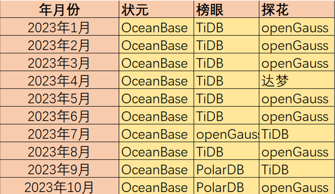 回看墨天轮的排名,榜眼探花状元位置常换,历届交替,始终是开源数据库稳居首位。从侧面来看,也可见证开源的力量。见下面2023年历届数据