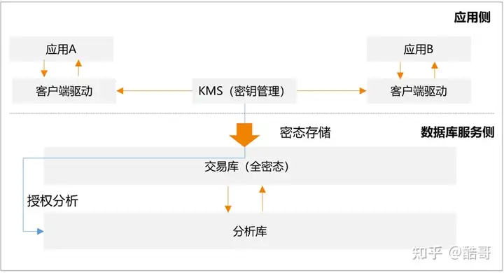 另外,ERP应用的时候有一个特点,交易查询完之后,下游还有一个分析库处理,我们有一个密钥授权能力,在业务负责人将密钥权限授权下游处理节点后 ,数据库就把密文数据解密后托管给下游处理,这样后台数据就可以不经过客户端,不同的应用只需要使用同一个KMS(密钥管理)就可以操作同一部分数据。另外,只要业务负责人不把密钥授权给其他任何人,就没有人能处理这个数据,包括管理和运维人员。