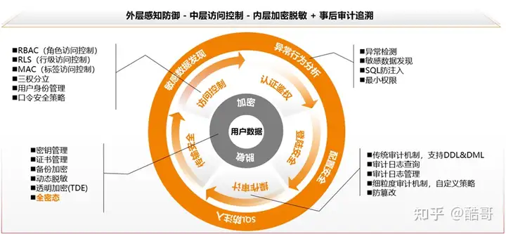 这个架构的最外层,是基于智能化能力做一些风险、异常行为的感知,先感知有没有恶意攻击,阻挡一遍攻击。中层是访问控制能力,加上口令、身份认证等,进一步控制用户访问风险。里层是数据加密、脱敏,直接在数据上做文章,因而攻击者即使将外层全部攻破,拿走的也全部是密文状态下的数据。