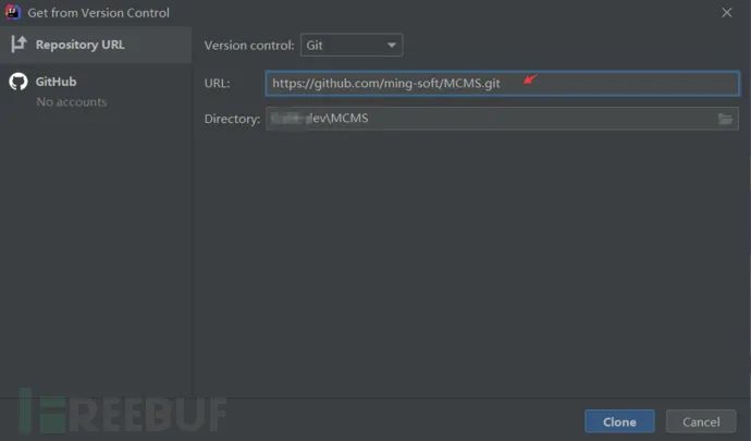 我们使用一个开源的cms来分析,java sql注入问题适合使用反推,先搜索xml查找可能存在注入的漏洞点-->反推到DAO-->再到实现类-->再通过调用链找到前台URL,找到利用点,话不多说走起Idea首页 点击Get from Version Control,输入https://gitee.com/mingSoft/MCMS.git