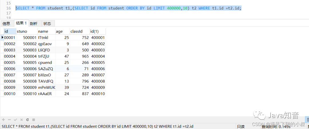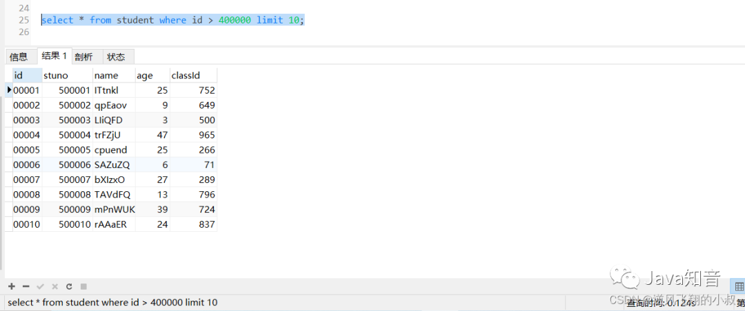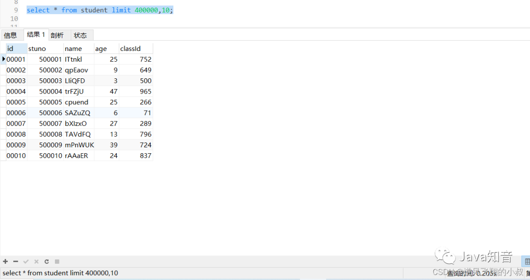 分页查询是开发中经常会遇到的,有一种情况是,当分页的数量非常大的时候,查询的时候往往非常耗时,比如查询student表,使用下面的sql查询,耗时达到0.2秒;